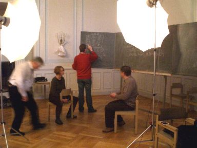 Von außen macht das alte und mit Graffiti beschmierte „Nachbarschaftshaus“ zunächst einen ungemütlichen Eindruck, doch innen sind die Räume angenehm hell. Es ist noch etwa eine halbe Stunde bis zum Fotoshooting, also genug Zeit um etwas zu trinken und sich mit zwei Seniorinnen zu unterhalten, die ebenfalls mit ihrem Projekt, einem generationsübergreifenden Theater aus Freiburg, nominiert sind. Alle sind sich einig: Bei 650 Bewerbern unter die ersten Drei zu kommen, ist schon ein großer Erfolg!Um 13:00 Uhr trifft das Foto-Team ein. Nach einer freundlichen Begrüßung bereitet das Team von „FischerAppelt Kommunikation“ die „Location“ und die „Models“ vor. Alle vier werden geschminkt, kleine Unreinheiten, rote Bäckchen und Augenringe weggepudert. „Mein ganzes Gesicht kribbelt!“ meint Julian aufgeregt. Nach einer halben Stunde hat Christiane, die für das Make-up zuständig ist, alle EULEN „fotofein“ geschminkt. Jetzt beginnt das eigentliche Fotoshooting: Die vier Models sollen eine Unterrichtssituation aus einem Handykurs nachstellen. Sie werden vor einer Tafel so gruppiert, dass alle auf dem Foto zusehen sind. Zuvor hat „Lehrer“ Julian in Schönschrift „DIE EULE – Handykurs“ an die Tafel geschrieben, darunter einige Menüpunkte eines Handys, denn alles soll möglichst authentisch wirken.Jetzt sitzen die drei Schüler, also Mechthild Recker, Peter Rucklshauß und Manfred Bullik um ihren „Lehrer“ Julian herum, der lässig auf der Lehne des Stuhls sitzt, wie vom Fotografen gewünscht. Die drei Schüler haben ein Handy in den Händen. Schüler Manfred Bullik bekommt das Handy des Fotografen, auf dem unglücklicherweise andauernd seine Freundin anruft! Dennoch werden zwei Filme mit Fotos von unterschiedlichen Situationen voll geknipst: „Lehrer“ Julian sitzend, stehend, zeigend, lachend, erklärend…