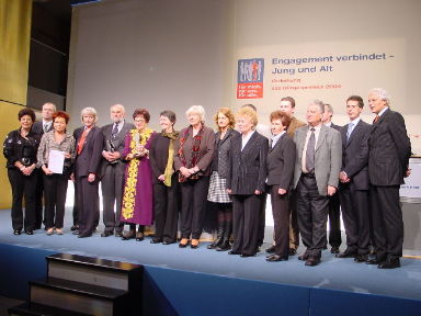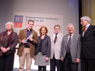Nun ist es so weit, als zweite Kategorie wird der Preis für das engagierteste Projekt, dass wischen Jung und Alt eine Brücke baut, vergeben. Trotz des Lachen beim Anblick der auf die Leinwand projizierten Bildern des Fotoshootings, ist die Nervosität und Spannung hoch. Umso größer ist die Freude, als verkündet wird, dass der „Bürgerpreis 2004 der