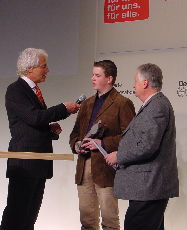 Initiative ,für mich, für uns, für alle!’ an das Projekt „Die EULE“ aus Rietberg verliehen wird“, nur mit dem Namen der Schule „Nepomucenum“ hat der Moderator so seine Probleme „da muss ich wohl noch mal hin, damit ich das lerne!“ meint er.Die vier Vertreter der EULEN haben im Vorfeld entschieden, dass Julian Fischer und Peter Rucklshauß den Preis entgegen nehmen, denn sie verkörpern das Projekt: ein Schüler-Lehrer und ein Senioren-Schüler.
