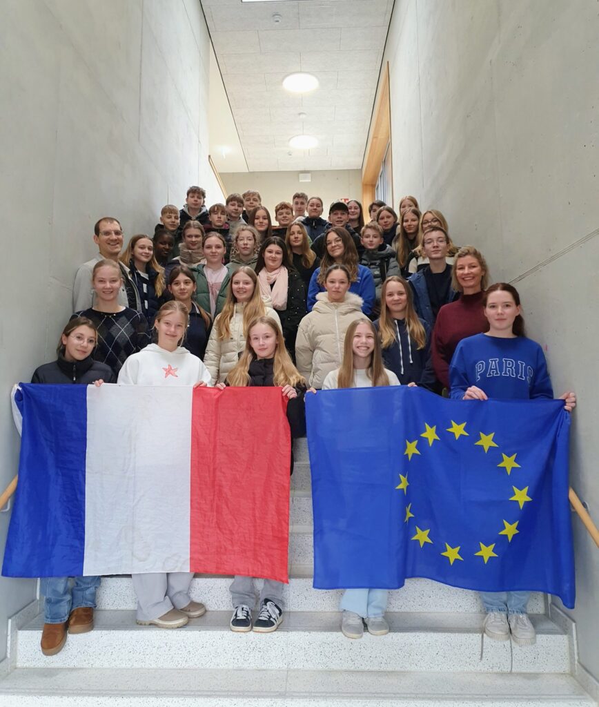 Frau Kroner hat mit uns – also den Französisch Schüler*innen der Mittelstufe – verschiedene Spiele und Aktionen gemacht. Zuerst haben wir ein Würfelspiel gespielt, bei dem wir uns auf Französisch vorstellen sollten. Danach wurden wir in 2 Teams eingeteilt und haben gegeneinander gespielt. Das Alphabet stand vorne an der Tafel und wir sollten französische Wörter zu den jeweiligen Buchstaben aufschreiben. Bei dem dritten und letzten Spiel handelte es sich um einen Song von dem in Frankreich sehr bekannten Hip-Hop-Duo BigFlo & Oli. In diesem Song kamen verschiedene französische Städte vor, wenn wir diese hörten, sollten wir klatschen. Darauf folgte eine Quizfrage zu der jeweiligen Stadt, die gehört wurde. Das Team, das diese Frage richtig beantwortete, bekam einen Punkt.
