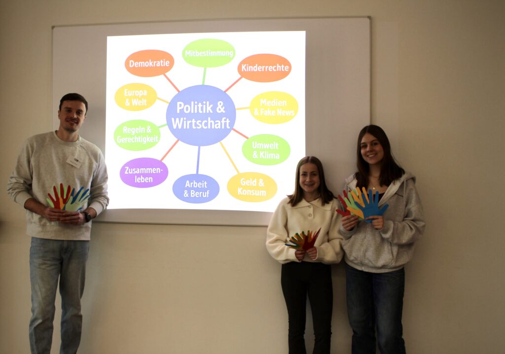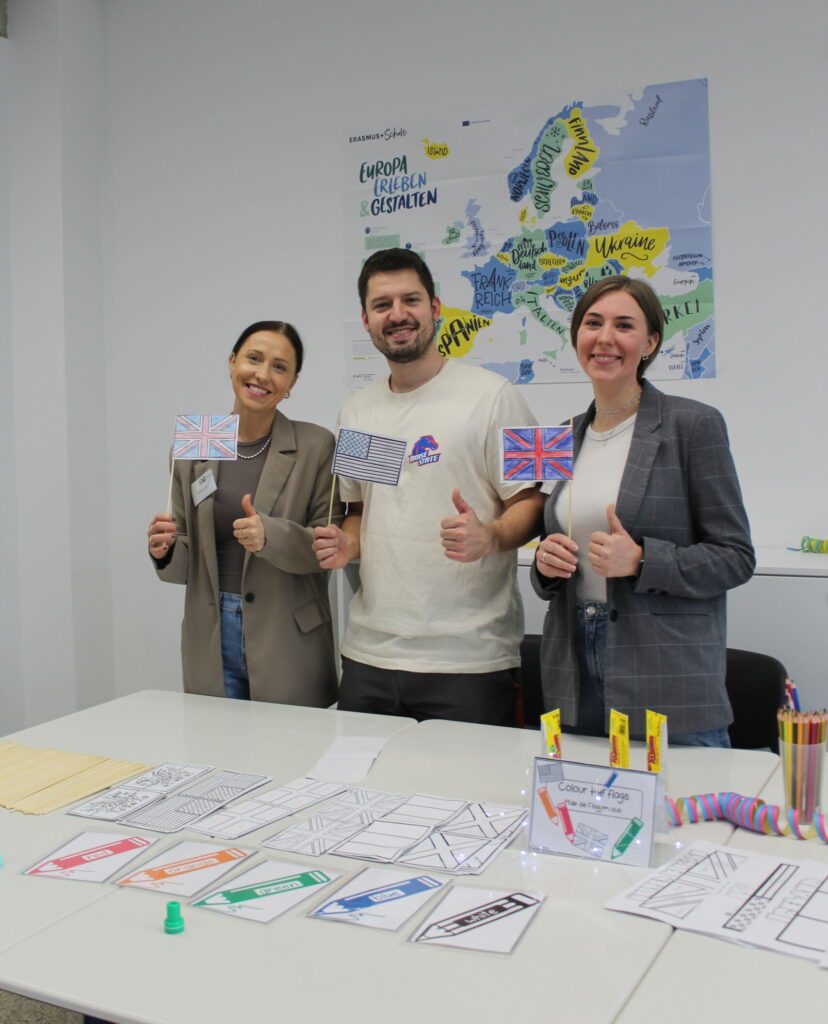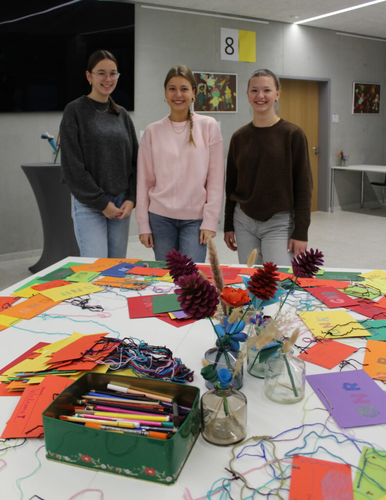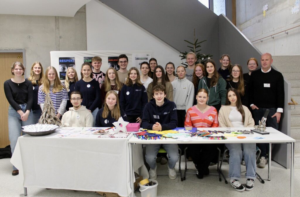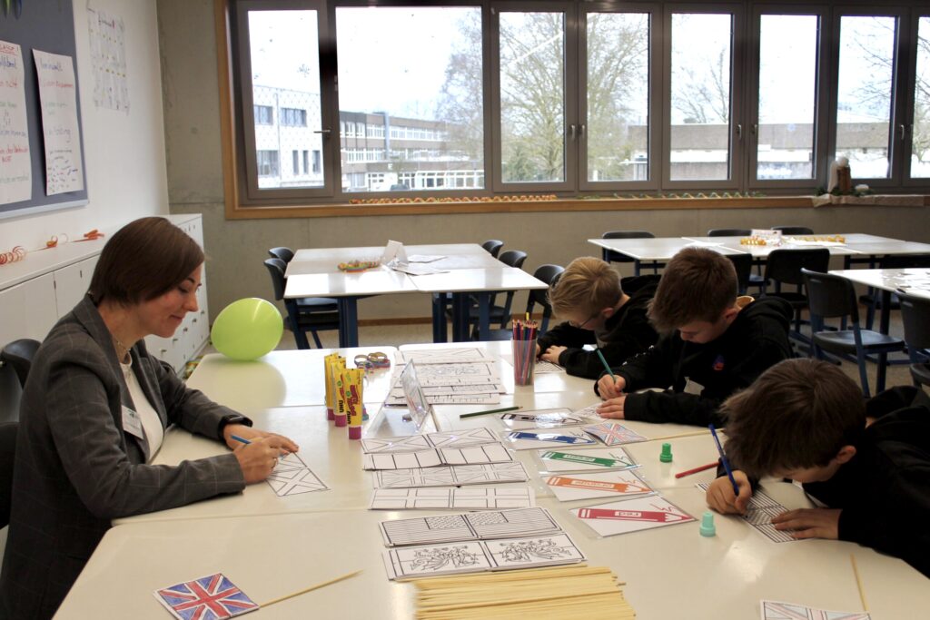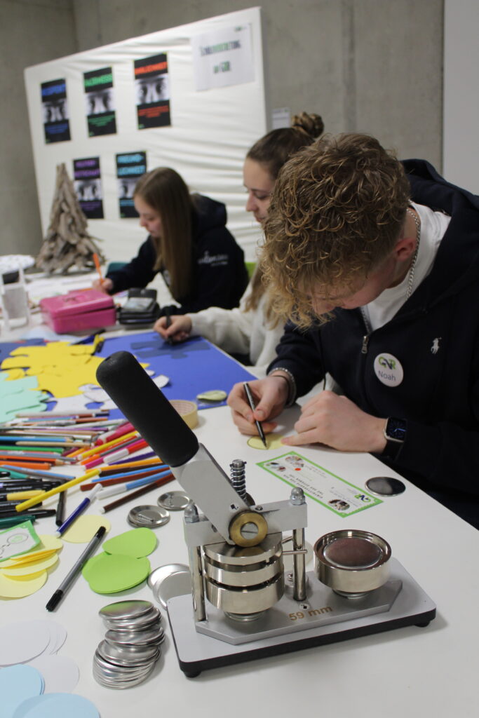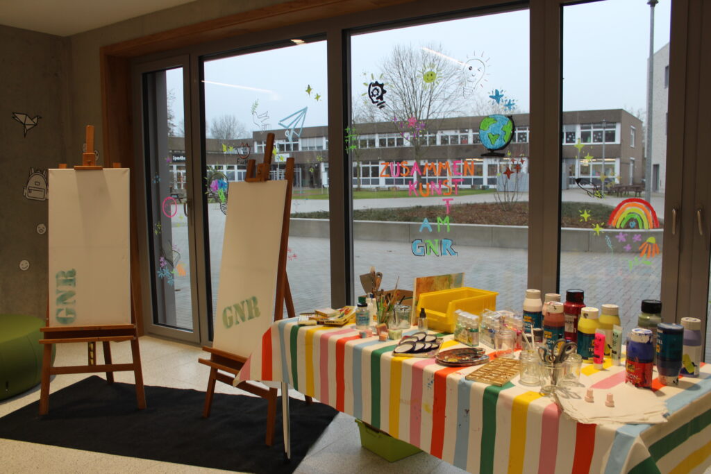 Ganz im Zeichen des Mitmachens luden auch Stände im Erdgeschoss und im ersten Obergeschoss zum Verweilen und Informieren ein. Beim Stand der SV/ Mini SV konnte man Buttons herstellen, bei der neuen Schülergenossenschaft eine Stimme zur zukünftigen Produktpalette abgeben und bei der Tombola erste GNR-Produkte gewinnen. Bei der AG Schulsanitätsdienst konnte man die stabile Seitenlage ausprobieren und beim Angebot der “Soundcrew” einige der vorgestellten Blechblasinstrumente. Beim Kunstprojekt “ZusammenKUNST” wurden die Gäste selbst kreativ. Im Raum der BNE-Gruppe gab es neben der “Upcycling”-Station eine Sammlung von Namensvorschlägen für die neuen Mitbewohner am GNR, verschiedene exotische Insekten (ein Geschenk eines Kooperationspartners bei der Umweltbildung). Außerdem stellten sich weitere Bereiche wie die Beratung und die Schulsozialarbeit an Ständen vor. Auch wurden die Werte am GNR (“Gemeinsam geht es besser”) und die Mobilitäten durch „Erasmus+ am GNR“ präsentiert. Nach dem Sammeln der vielen Eindrücke gab es noch die Möglichkeit eines gemeinsamen Mittagessens in der neuen Mensa des GNR.