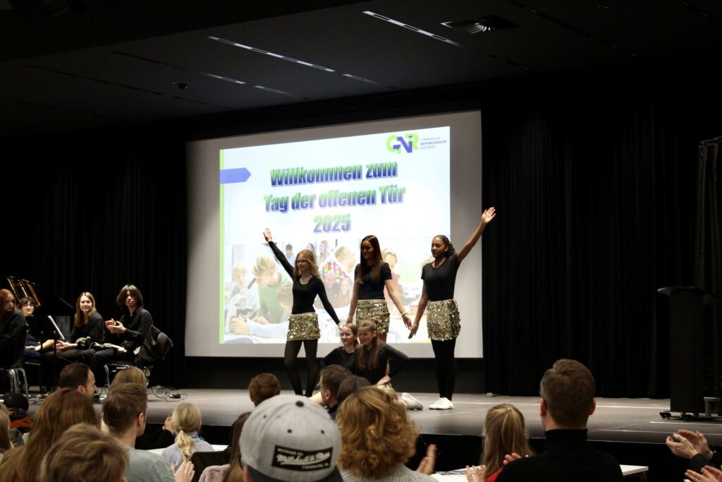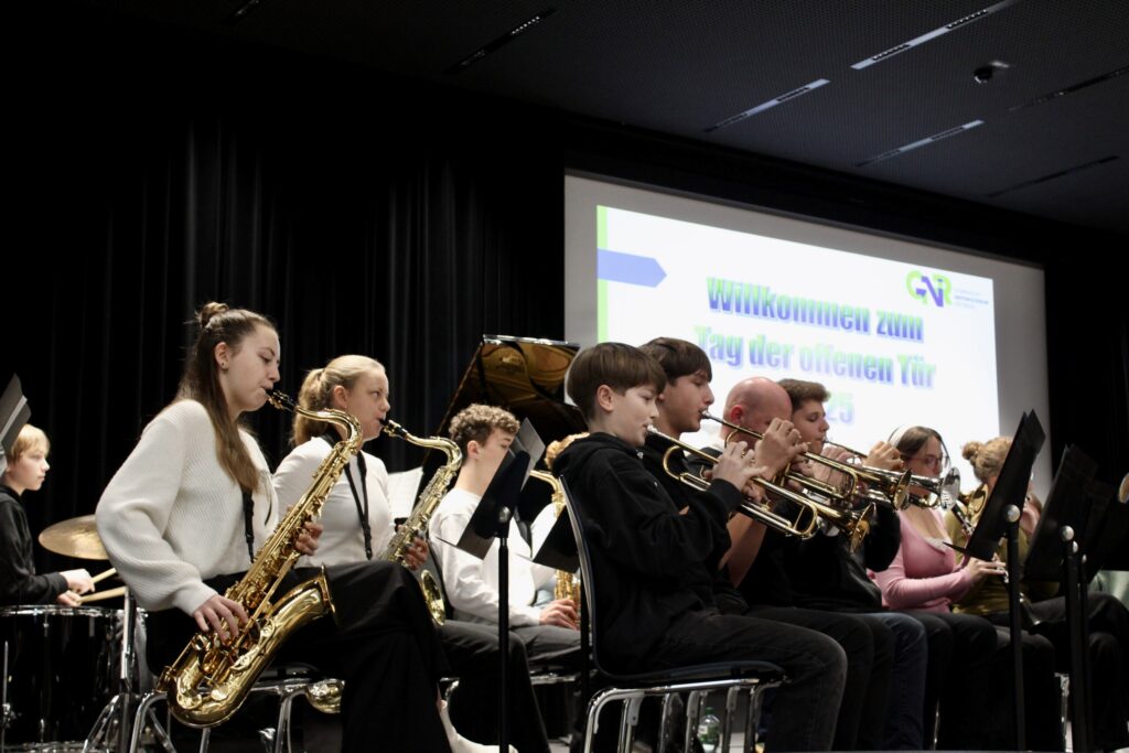 Eröffnet wurde der Tag mit einer gemeinsamen Veranstaltung in der neuen Aula. Die Bigband unter der Leitung von Annika Natsch sorgte für die musikalische Gestaltung und eine Tanzgruppe aus der Jahrgangsstufe 8 begeisterte ebenfalls mit ihrem Auftritt. Schulleiter Matthias Stolper richtete das Wort an die anwesenden Gäste: ,,Wir haben einen schönen Tag vorbereitet, nicht nur Einblicke in das grandiose neue Gebäude – auch als Auftakt für die kommende Entscheidung. Diese Entscheidung führt danach zu etwas Großem: nicht nur neue Fächer, sondern auch das Entdecken von Seiten an euch, die ihr noch gar nicht kanntet.” Elternpflegschaftsvorsitzende Melanie Haarannen wies auf Gesprächsmöglichkeiten mit Eltern hin und betonte besonders die Gemeinschaft am GNR: ,,Alle ziehen hier an einem Strang, man kann hier seine Talente entwickeln”. Abschließend erläuterte Erprobungsstufenleiter Jörg Buttgereit – auch im Namen seiner Stellvertreterin Lena Moor – das vielfältige Angebot aus Führungen und Mitmachaktionen in den Klassenräumen und auf den Fluren des neuen Schulgebäudes. Dabei machte er deutlich: “Wir werden heute zum einen viel zeigen und zum anderen euch viel selbst entdecken, forschen und experimentieren lassen, damit alle Gäste einen sehr genauen Einblick in das Schulleben und die Schulgemeinschaft erhalten”, so Buttgereit.