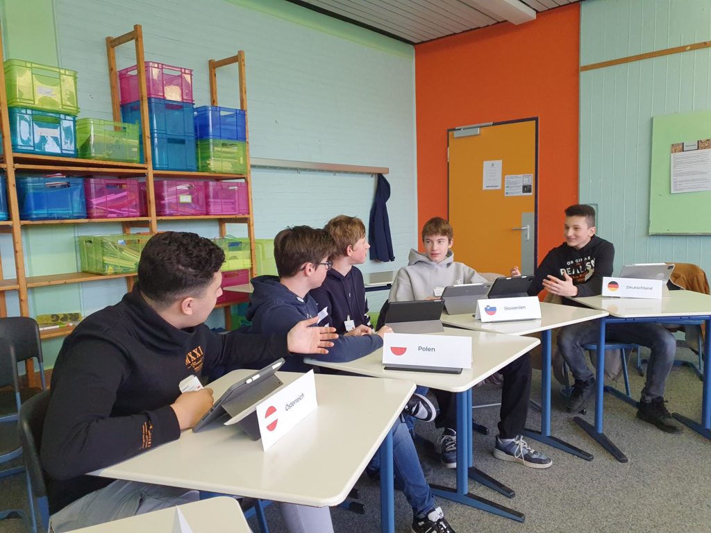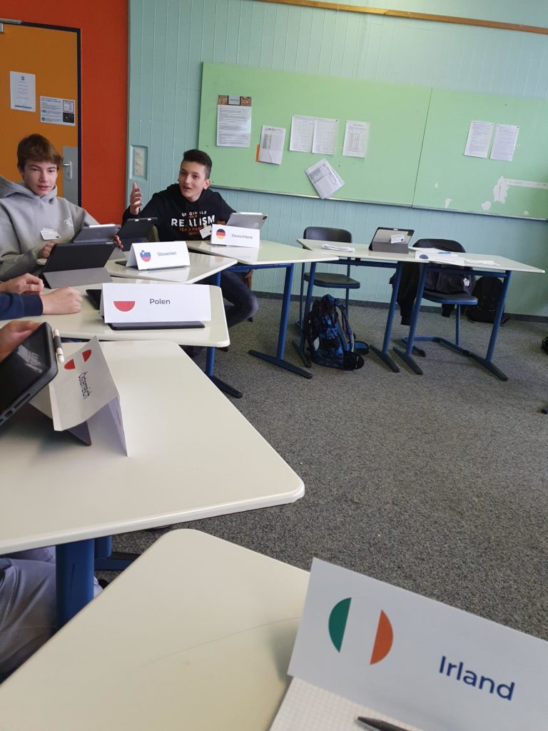 Für den Projekttag am 26. Januar 2023 hatte das Organisationsteam aus drei Mitgliedern der Europa AG (Frau Amedick, Frau Reich und Frau Finkeldei) und zwei Mitarbeiterinnen von Europe direct Kreis Gütersloh (Frau Schmitz und Frau Schwekutsch) für die Jugendlichen die Durchführung von Planspielen vorbereitet. Nach einem gemeinsamen „EU-Warmup“ und einer Einführung in die EU-Institutionen schlüpften die Jugendlichen klassenweise den Rest des Vormittags in die Rolle von politischen Akteuren im EU- Gesetzgebungsverfahren. So simulierten die 9a und die 9c die Verhandlungen des Rates der EU („Ministerrat“) über eine neue EU-Verordnung zur Bekämpfung von Fakenews und Hate Speech in sozialen Netzwerken (Digital Services Act). Die Klassen 9b und 9d waren als Abgeordnete des europäischen Parlamentes in Fragen der Vermeidung von Plastikmüll und des Recyclings gefordert. In beiden Planspielen simulierten die Neuntklässler konkrete Abläufe und Verhandlungen als Reaktion auf einen Entwurf durch die EU-Kommission.