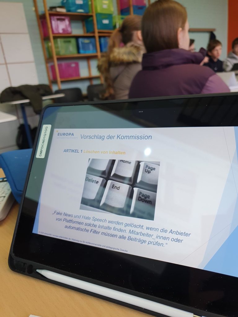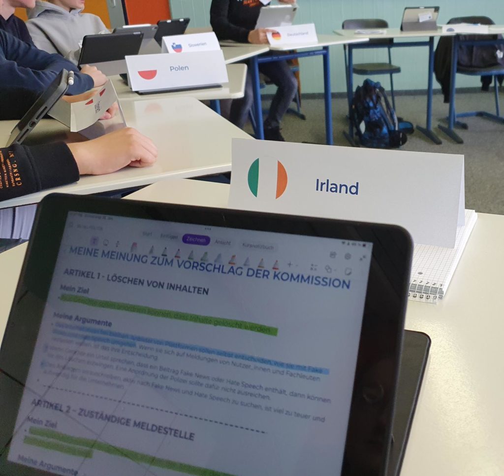 Es wurden in den Klassen 9a und 9c Rats-Sitzungen und informelle Gespräche von MinisterInnen aus 10 EU-Mitgliedsländern zu einer möglichen EU-Verordnung zum Umgang mit Hate Speech und Fakenews durchgespielt. Die Jugendlichen arbeiteten sich dafür in Zweierteams in die Argumente ihres zugeteilten Landes ein und verhandelten sehr konkret zu den drei Fragen: Wer löscht dann Fakenews und Hate Speech? In welchem Land befinden sich die Meldestellen? Innerhalb welcher Fristen muss gelöscht werden? Hier wurde von den SchülerInnen ein sehr genaues Argumentieren gefordert: Was sind z.B. die Vor- und Nachteile, wenn die Meldestelle im Land des Nutzers sitzt? Was passiert, wenn Gerichte die Löschung erst anordnen müssen? Ist ein Löschen innerhalb von 12 Stunden praktikabel? Außerdem galt es, auch einen strategischen Blick zu entwickeln: Wie können wir zu einem Kompromiss kommen?