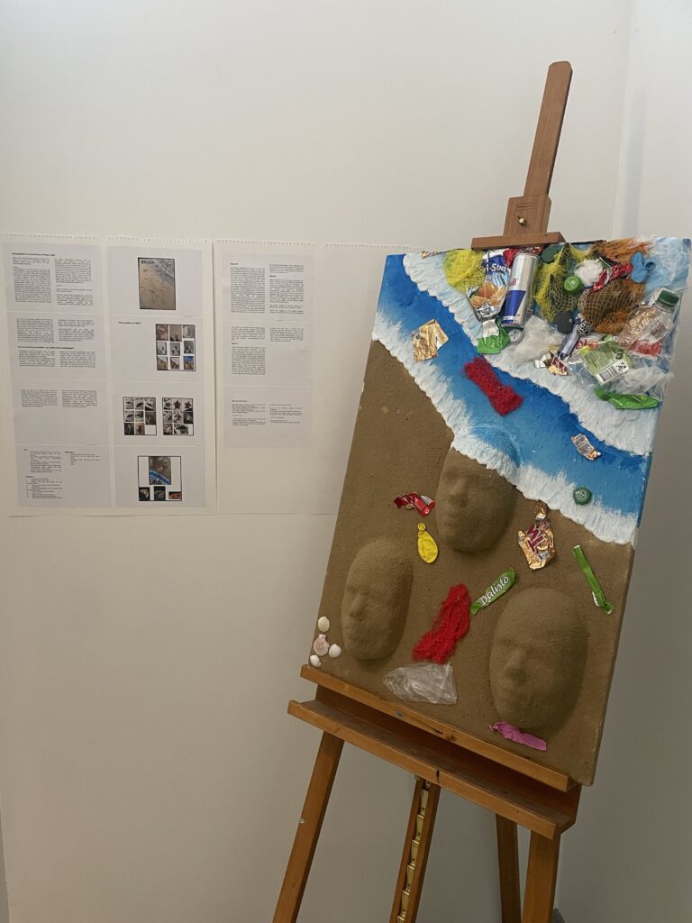 Auch Stephanie setzte sich mit den dramatischen Auswirkungen von Umweltverschmutzung auseinander. Ihre Maske auf Leinwand verdeutlicht, wie Tiere sich der Müllflut zu entziehen versuchen, ein eindrucksvolles Zeichen gegen die zerstörerische Wirkung der Umweltverschmutzung auf Meereslebewesen.