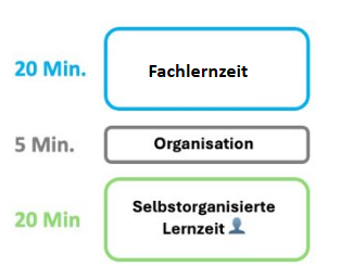 1. Jede Lernzeit ist wie bisher einem Hauptfach zugeordnet (Deutsch, Mathematik, Englisch und 2. Fremdsprache). Es gibt eine zwanzigminütige Phase, in der Schüler*innen Übungen aus dem angedockten Hauptfach bearbeiten.