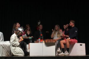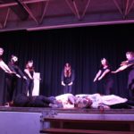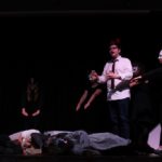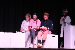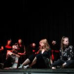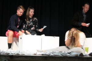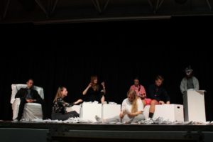 Zweimal die 7, dreimal die 6 und der Teufel – der Q1- Literaturkurs entführte das Publikum an zwei Abenden unter der Regie von Andrea Schüthuth und Regieassistenz von Jaqueline Budde und Schülerin Elisa Karl in die Lage von 7 Personen in einem Raum, aus dem es für diese kein Entkommen gibt. Nicht einmal durch den Tod. Am Ende des Stückes sitzt das Publikum vor dem Bühnenboden voll hunderter selbst gebastelter Papierschiffchen.