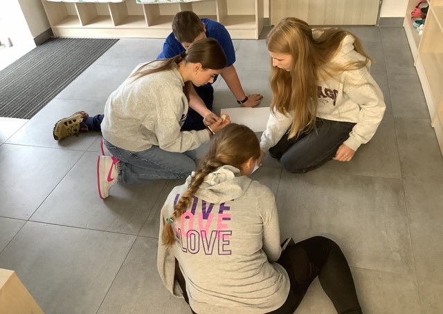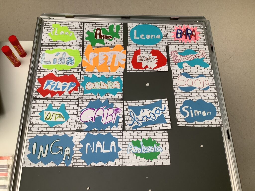 Am Morgen trafen wir uns im Klubko, einem Familien- und Jugendzentrum, das eng mit dem Droste-Haus in Verl zusammenarbeitet. Unser Programm begann um 9:00 Uhr. Zunächst saßen wir gemeinsam im Kreis und spielten verschiedene Kennenlernspiele, um uns besser kennenzulernen. Anschließend gestalteten wir unsere Namen als Graffiti-Schriftzüge, die am Ende zu einem großen Gemeinschaftsbild zusammengesetzt wurden.