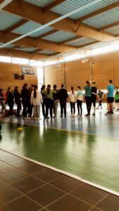 Nachdem wir von 08:00 bis 10:00 die Bildreportagen zu unserem Aufenthalt in Frankreich fertiggestellt und ausgedruckt haben, sind wir zur Sporthalle neben der Schule gelaufen. Dort haben wir zum Aufwärmen zuerst ein typisches französisches Ballspiel gespielt: Balle au capitaine (eine Mischung aus Handball und Zombieball). Nachdem wir in 6 Gruppen aufgeteilt wurden, hat das Spiel begonnen.